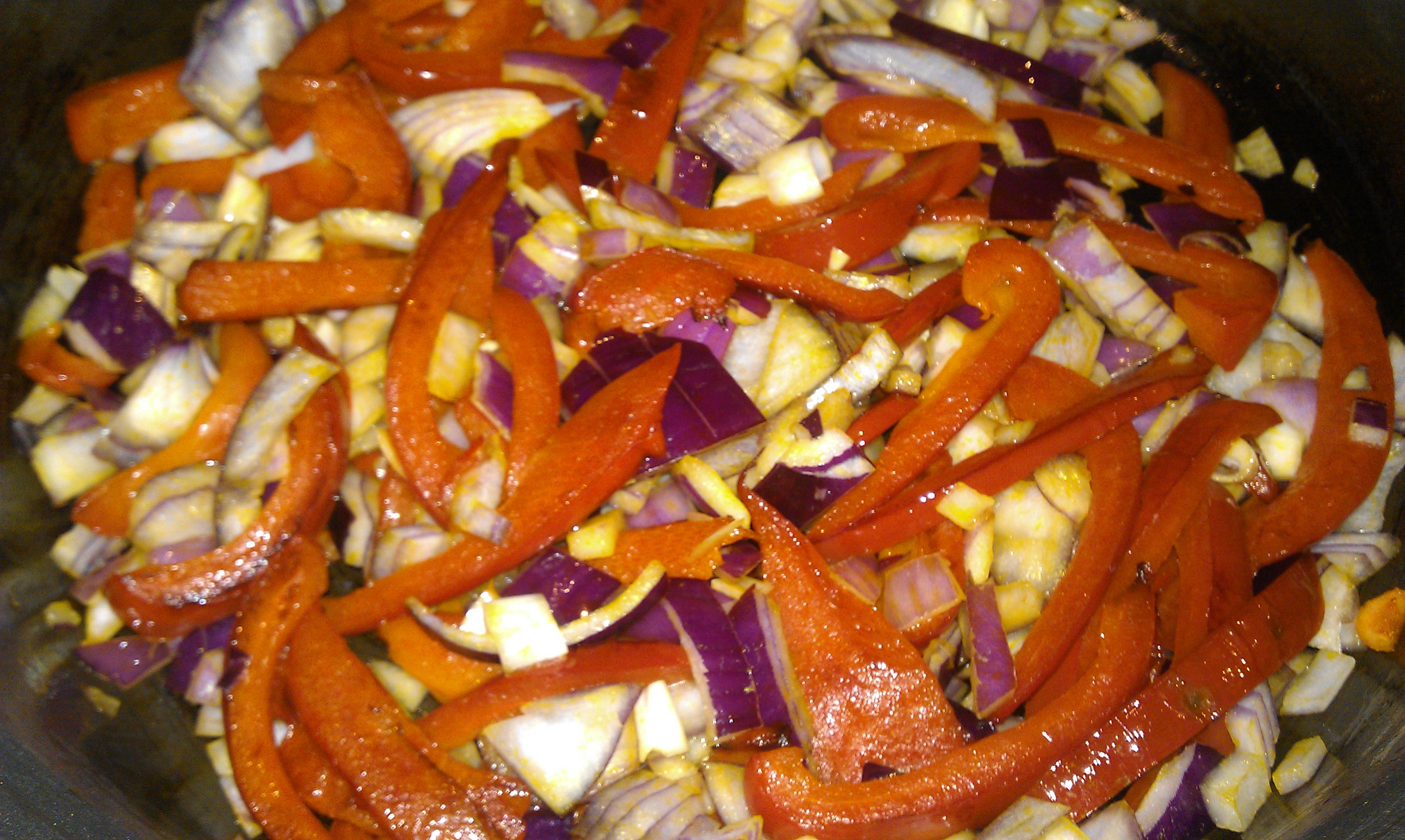 Purloin a red capsicum, slice it thinly a la julienne and sweat it off in extra virgin olive oil for about 15 mins, and then add a diced red onion and cook until unctuous.