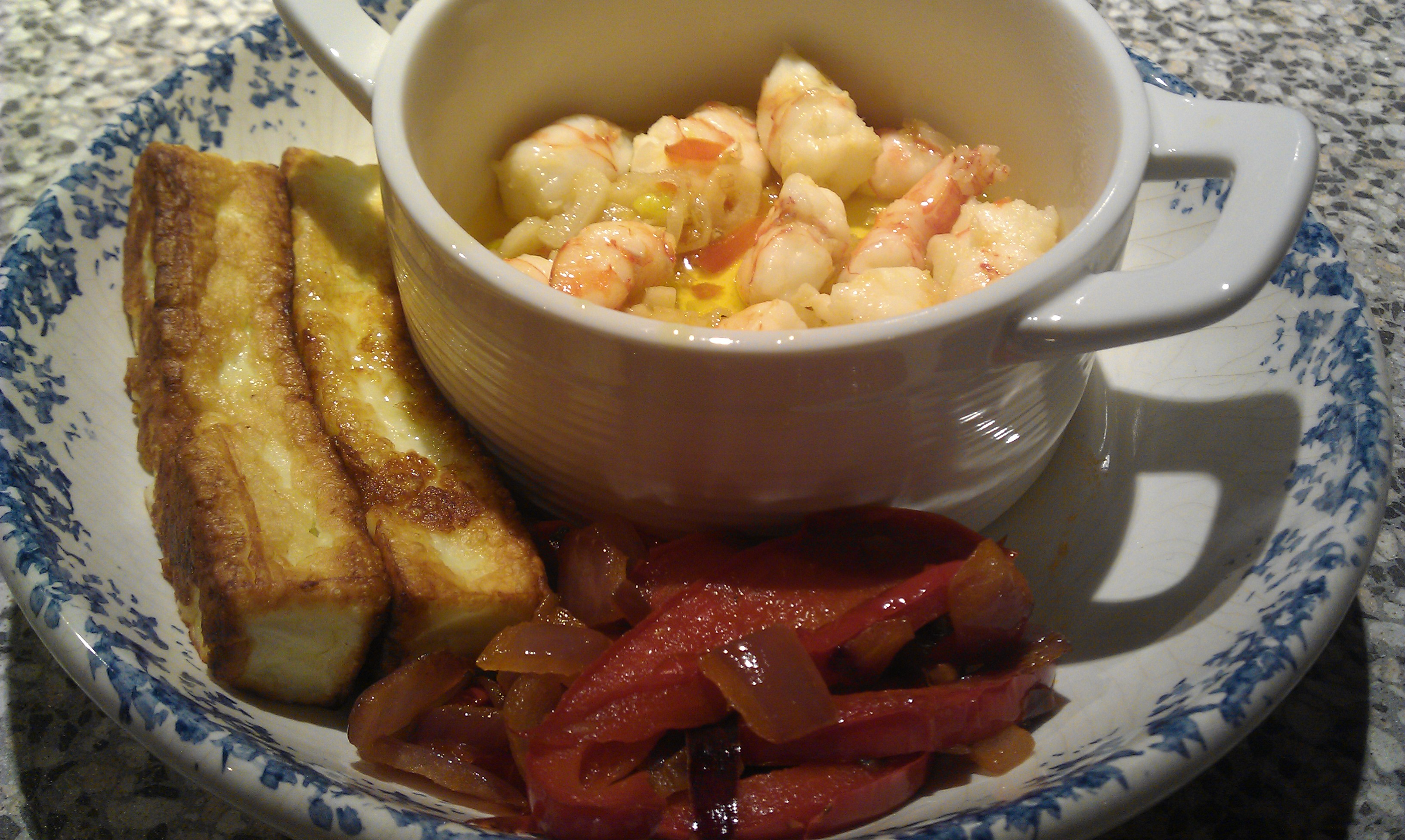 Take some large tiger prawns, the fat juicy ones, that look promising. Add a few cloves of sliced garlic, a chopped chilli and some extra virgin olive oil. Fry in a good pan until cooked. Appreciate the aroma as you do so.